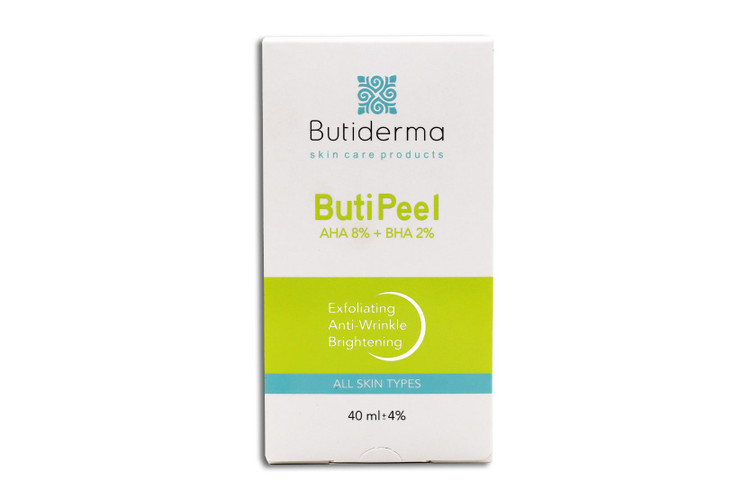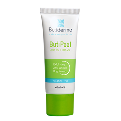 کرم لایه بردار صورت بیوتیپیل بیوتی درما 40 میلی لیترButiderma Butipeel AHA 8% + BHA 2% All Skin Cream 40ml؛ حاوی آلفا هیدروکسی اسید و بتا هیدروکسی اسید (BHA) میباشد که با لایهبرداری به کاهش چین و چروک و جای جوش کمک میکند. همچنین موجب روشنتر شدن پوست میگردد. این فرآورده فاقد عطر و مناسب برای انواع پوست است.